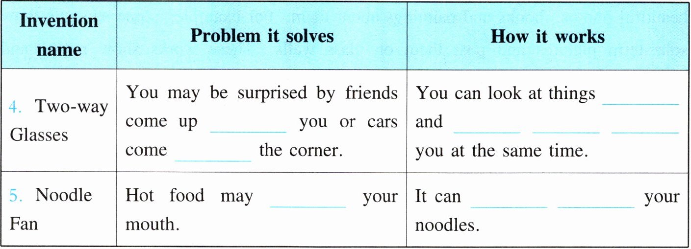 | 4. Two-way Glasses | You may be surprised by friends come up ______ you or cars come ______ the corner. | You can look at things ______ and ______ ______ you at the same time. |
