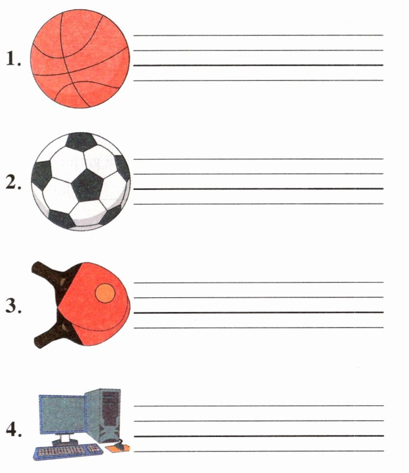 三、学校体育馆新买了一些运动器材和其他物品,我们一起来看看都有什么,选出正确的单词并写在四线三格中吧。