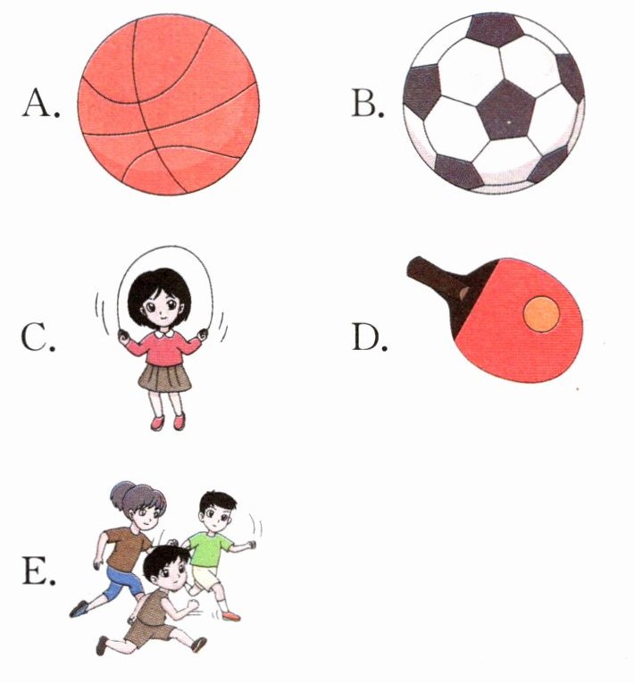 1. football; B 2. ping-pong; D 3. basketball; A 4. players; E 5. skipping; C