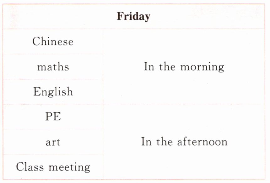六、新题型·识读表格 下面是 Lingling 今天的课程表,一起看一看,完成下列任务吧。