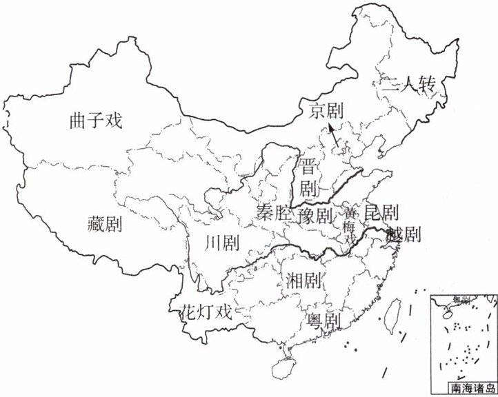 (2024·新疆中考)“小舞台,大智慧”,中国戏曲源远流长,种类繁多,百花齐放。读我国部分地方戏曲分布图,完成第 14—15 题。