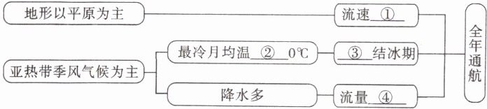 (2) 分析京杭大运河南方河段全年通航的原因,补充下列图表内容。