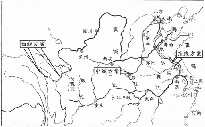 (2) “南水北调”3 种调水方案中,施工较容易的是