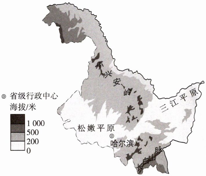 (2024·广东中考)(农业 + 高新技术主题)黑龙江省土地面积广阔,是我国推行“北斗 + 智慧农业”生产模式的试点省份。该生产模式通过使用“北斗”和搭载“智慧大脑”的农机,可自动进行精准的整地、播种、施肥、喷药、收获等作业。读黑龙江省地形分布图,完成第15—17题。