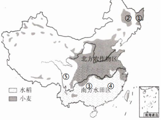 (1) 把①三江平原、②松嫩平原、③洞庭湖平原、④鄱阳湖平原、⑤成都平原这5个粮食集中产区的序号填注在图中。