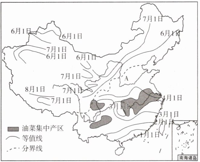 (3) 图中虚线A为冬油菜区和春油菜区的分界线,此线以南以东为
