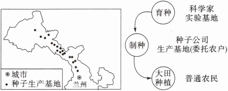 种业的安全关系到粮食的安全,也关系到国家的安全。从育种到制种再到大田种植,种、粮分工是现代农业的显著特点。在中国,有一条“种子繁育黄金走廊”——河西走廊。这里独特的光热条件对种子的干燥脱水非常有利,因此形成了全国最大的玉米、蔬菜、瓜类、花卉等对外制种生产基地。读河西走廊部分种子生产基地示意图,完成第9—11题。