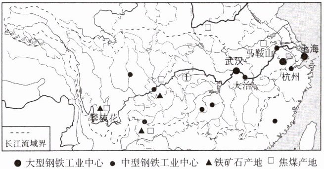 读长江流域钢铁工业园中心分布图,完成第16—18题。