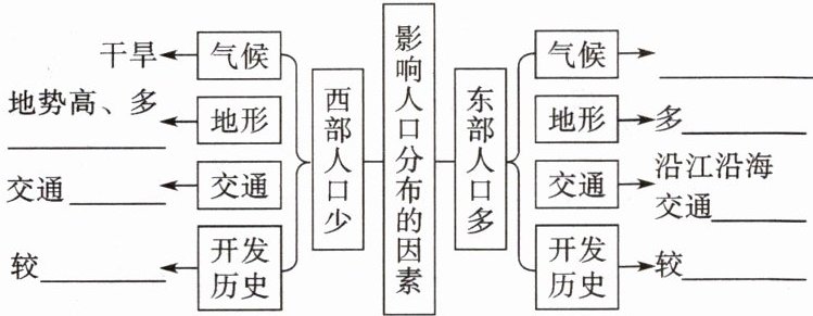 气候⟶,地形⟶多,交通⟶沿江沿海交通,较⟶开发历史 ⇆东部人口多
