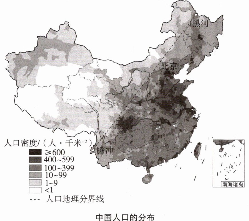 助记:我国的人口分布,人口分布不均匀,东多西少黑腾分;东南人口稠密区,西北人口稀疏地。