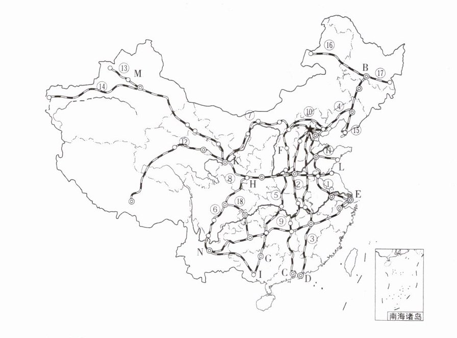 (3)⑩大秦 ⑪胶济 ⑫青藏铁路 ⑬北疆 ⑭南疆 ⑮哈大 ⑯滨洲 ⑰滨绥 ⑱成渝