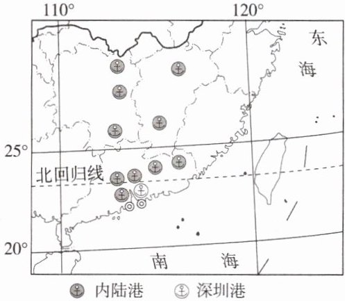 (2024·广东深圳中考)内陆港是指设在内陆城市,便于出口货物提前报关、报验的物流中心。2022 年深圳港新增多个内陆港,使更多货物通过深圳港出口到世界各地。下图为深圳港与其部分内陆港的地理位置示意图。据此完成第 15—17 题。