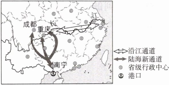 (2024·重庆中考)我国西部地区借助陆海新通道,通过公路、铁路与港口联运,实现了西部货物在广西大批量出海的历史夙愿。读陆海新通道和沿江通道位置示意图,完成第 12—14 题。