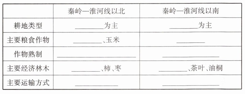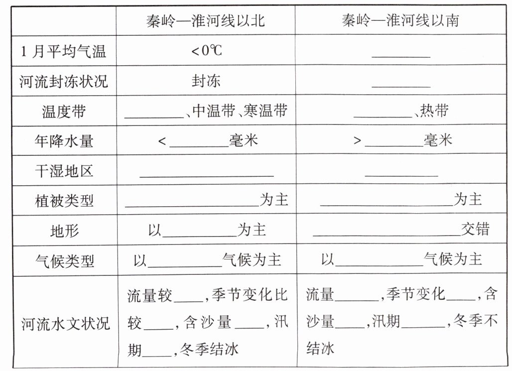 3.>0℃ 不封冻 暖温带 亚热带 800 800 湿润地区、半湿润地区 湿润地区 暖温带落叶阔叶林 亚热带常绿阔叶林 高原、平原 平原、盆地、丘陵和高原 温带季风 亚热带季风 小 大 大 短 丰富 小 小 长 旱地 水田 小麦 水稻 一年两熟、两年三熟或一年一熟 一年两熟到三熟 苹果 柑橘 铁路、公路 铁路、公路、水路