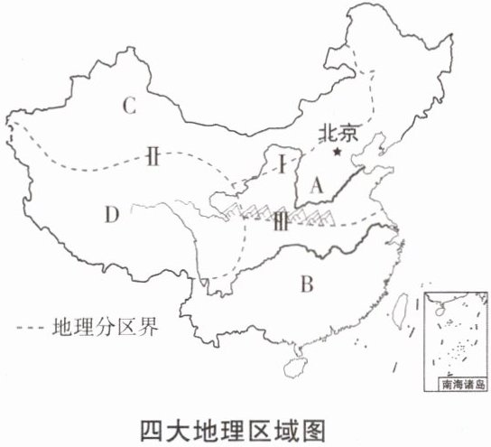 线,并根据实际情况作一定的调整,把中国划分为四大地理区域,即A北方