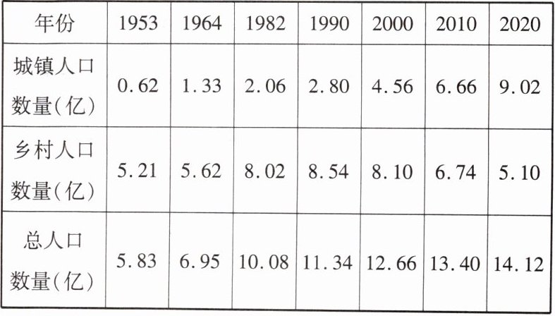 (2024·陕西中考)下表为我国历次人口普查城乡人口统计表(不含港澳台人口数据)。据此完成第12—13题。