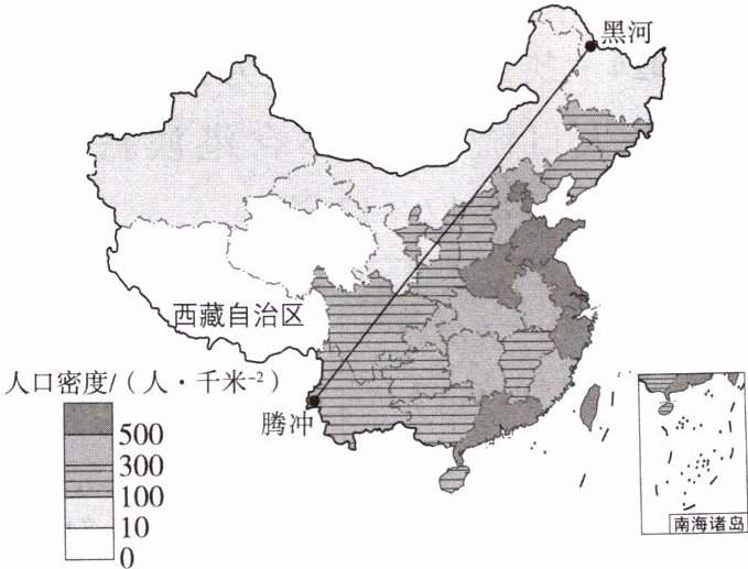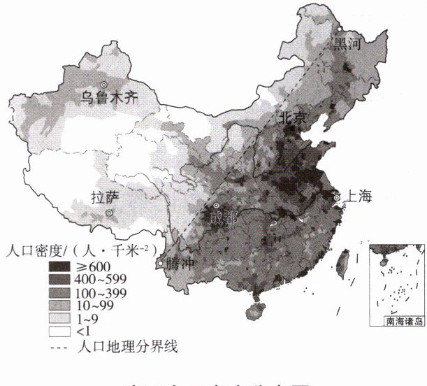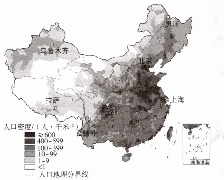 黑河—腾冲线是我国人口地理分界线。下图为我国的人口分布图。读图,完成第14—15题。