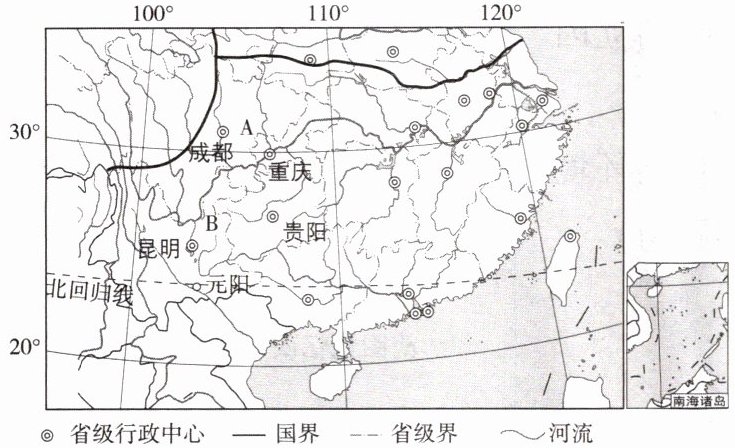 18. (2024·四川成都中考)南方地区树木常绿,山清水秀,河湖密布。下图是南方地区区域图。读图,完成相关问题。