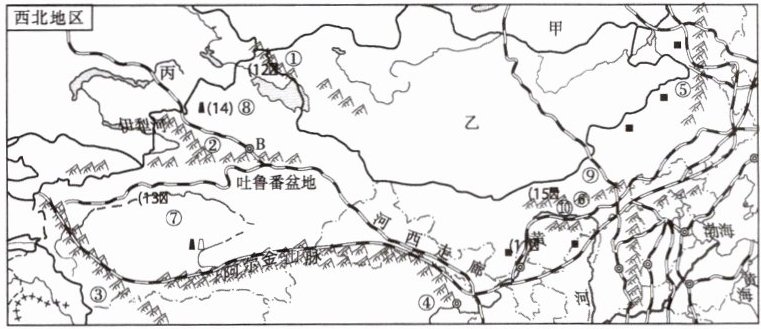 盆地,形成“三山夹两盆”的地形大势。“三山”由北向南依次是①阿尔泰
