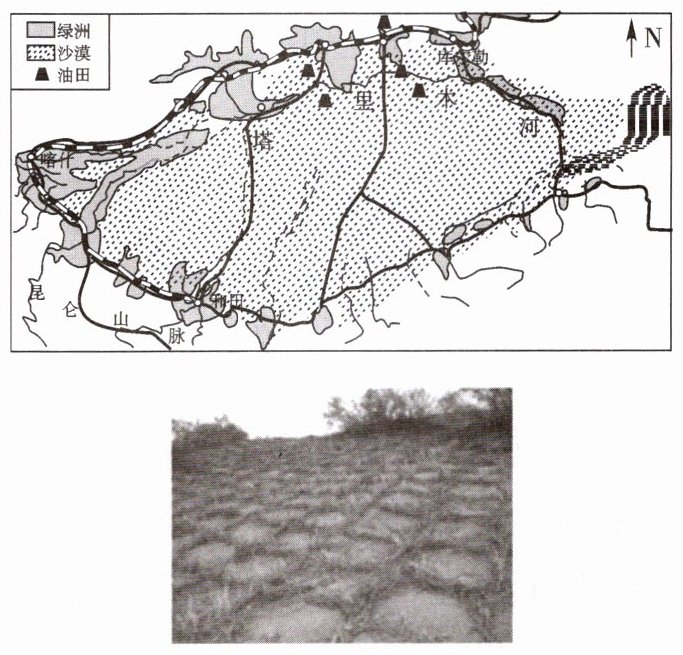 读塔里木盆地荒漠化发展地区分布示意图(阴影部分表示荒漠化发展地区)和草方格沙障图,完成第12—13题。
