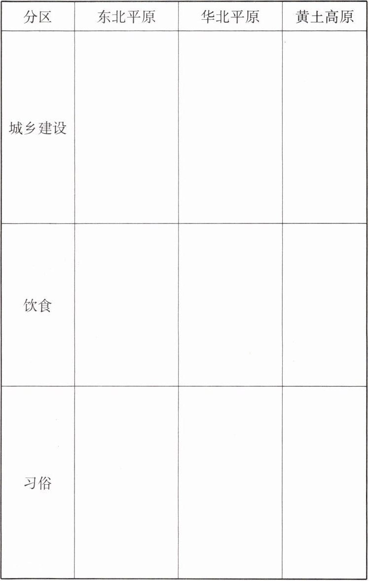 习俗 受满族、朝鲜族、俄罗斯文化影响,豪放热情,冬季活动丰富 受儒家文化影响深远,习俗传统严谨,尤其以京津、河北、山东为代表 受农耕与游牧文化交融影响,习俗质朴粗犷,带有西北特色