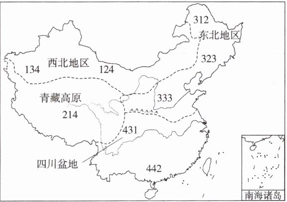 下图为中国气候资源类型等级图。图中每个地区气候资源类型用3个阿拉伯数字表示,左起第一位数为水分,中间一位数为热量,右边一位数为光照;数字1~4分别表示资源的质量等级,数字越大质量越优。据此完成第5—6题。