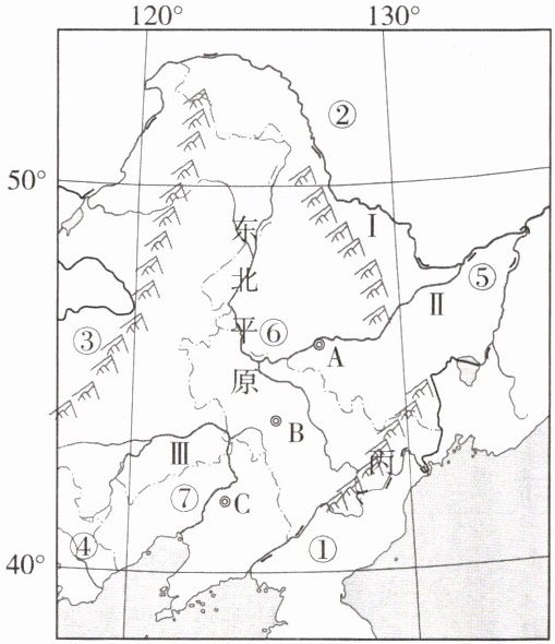 二。1.平原、丘陵和山地 黑龙江 山地 平原2.三江平原 松花江 松嫩平原 辽河平原 辽河3.小兴安岭 长白山脉4.较大 长 较小 春汛 夏汛 黑龙江 松花江5.平坦 稠密 三江平原 松嫩平原