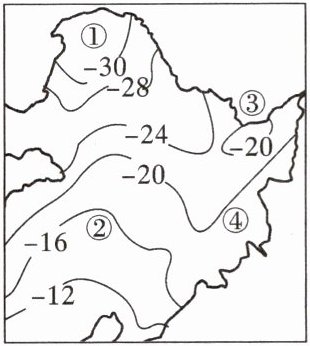 读东北地区 1 月平均气温图,完成第 13—14 题。