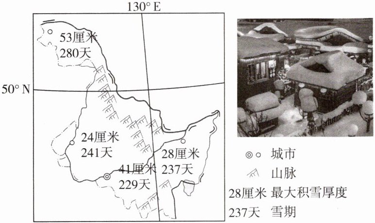 黑龙江省被誉为“冰雪之冠”,北京冬奥会上,中国代表团获得的 9 枚金牌中有 4 枚来自该省运动员。下图为黑龙江省雪期和雪厚分布示意图。据此完成第 11—12 题。