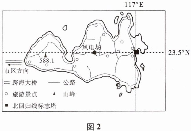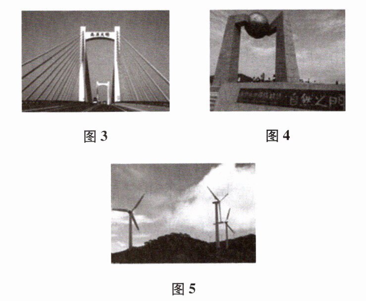 (节气)正午时,太阳光穿过该轴,垂直照射地面。③ 南澳岛东侧山顶建有亚洲第一岛屿风力发电场(图$5$)。与煤炭发电相比,风力发电的突出优点是