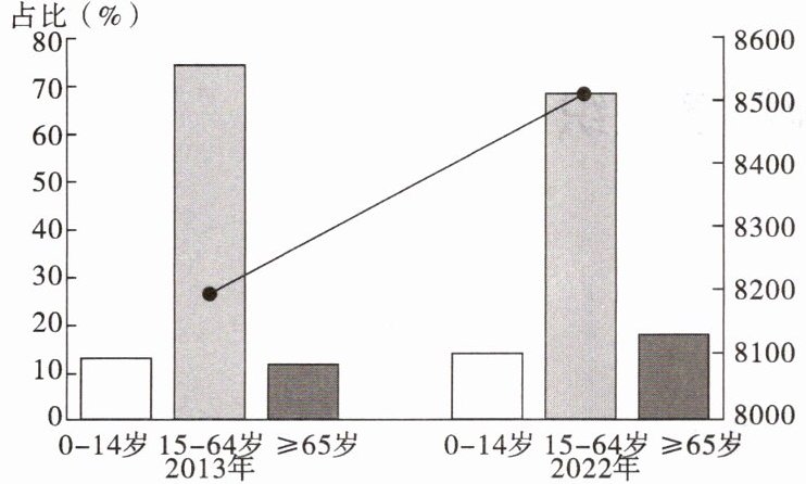 (2024·江苏苏州中考)(跨学科·数学)江苏省位于我国人口密集区。读江苏省 2013、2022 年人口年龄结构和人口总量统计图,完成第 1—3 题。