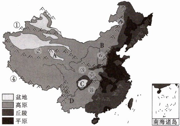 )②A为黄土高原,地势高峻,人口密度小于9人/平方千米。(