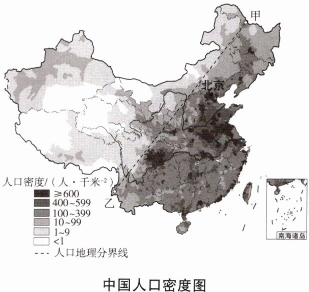 )③甲乙线以东多平原、丘陵,地形较为低平,所以人口稠密。(