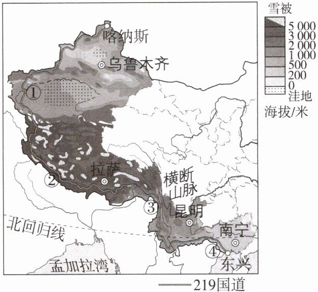 【实践探究】小明一家暑假计划自驾走219国道①段,他通过卫星导航系统查找219国道,得知219国道南起东兴,北至喀纳斯,全长超过1000千米。下图为219国道示意图。读图,完成第10—12题。