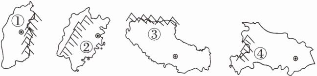 读4个省级行政区域单位轮廓简图及相关山脉图,完成第10—11题。