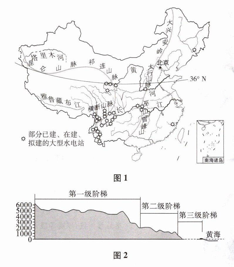 〈资料三〉我国地势三级阶梯及部分大型水电站分布示意图(图1)、我国沿36°N附近地形剖面示意图(图2)。