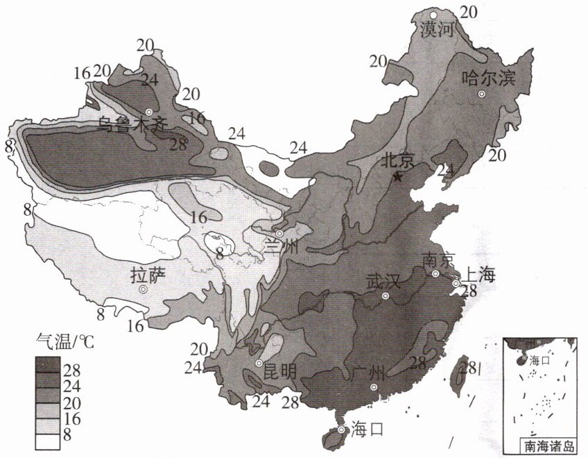,南北温差小。(3) 我国夏季气温最高的地区是