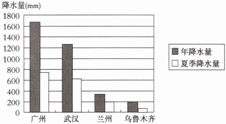 3. 读我国4个城市年降水量与夏季降水量柱状图,完成相关问题。