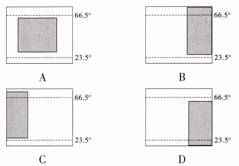 8. 正方形代表亚欧大陆,阴影部分代表中国,虚线表示北极圈和北回归线。下列选项中,最能反映中国位置的是(