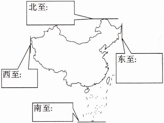 (1)将下列我国疆域四至点的代号准确地填入图框中。