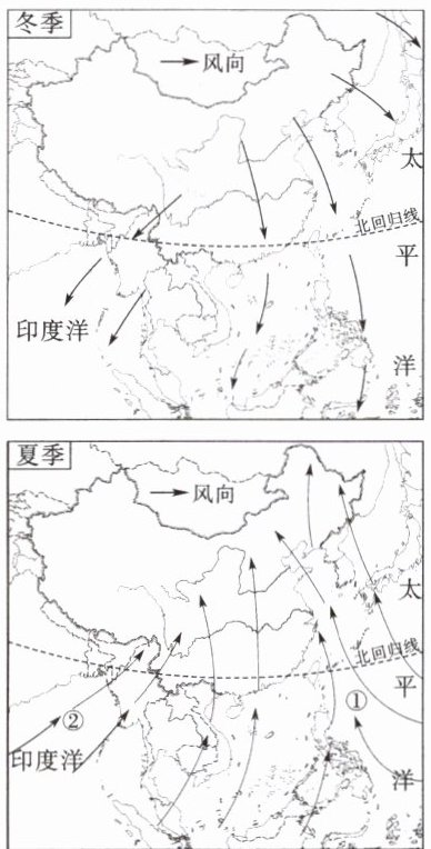 (1)受海陆位置和纬度位置的影响,我国大多数地区冬、夏季节盛行风向