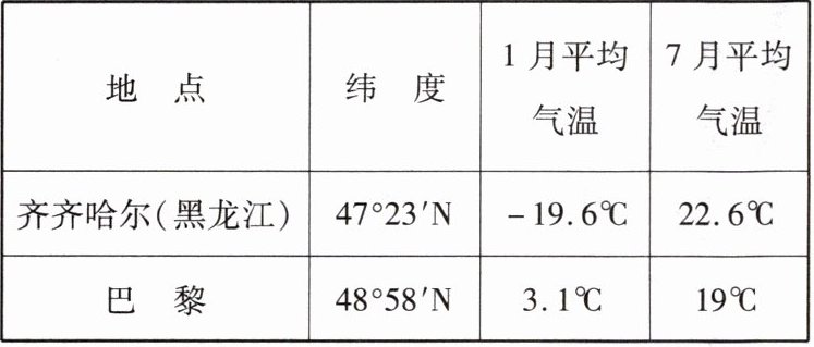6. 下表所示两地的纬度大致相近,但我国的齐齐哈尔气温年较差大。这体现的我国气候特点是(