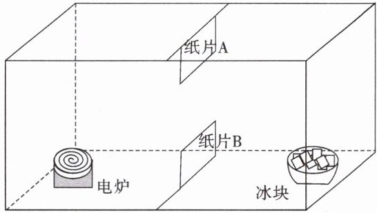 13. 在一个长、宽、高分别是 2 米、1 米和 1 米且六面都封闭的透明玻璃柜内,底面两侧分别放置一个电炉和一碗冰块。在玻璃柜顶面中部内壁贴一张下垂的纸片 A,在玻璃柜底面中部贴一张竖立的纸片 B(如图所示)。在电炉通电一段时间之后,根据纸片 A、B 的偏动情况,可以模拟验证的自然现象是(