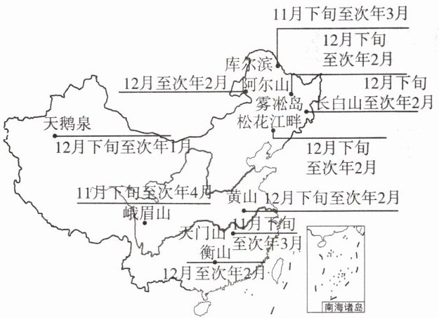 〈材料二〉下图示意我国雾凇主要分布地区、观赏期和雾凇景观。