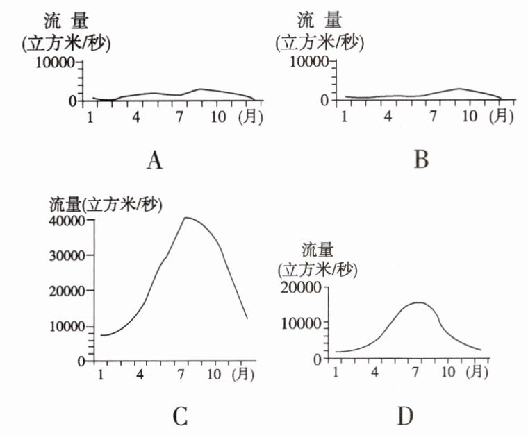 我国河流众多,许多大河源远流长。读我国东部四条大河流量年变化曲线图,完成第5—6题。