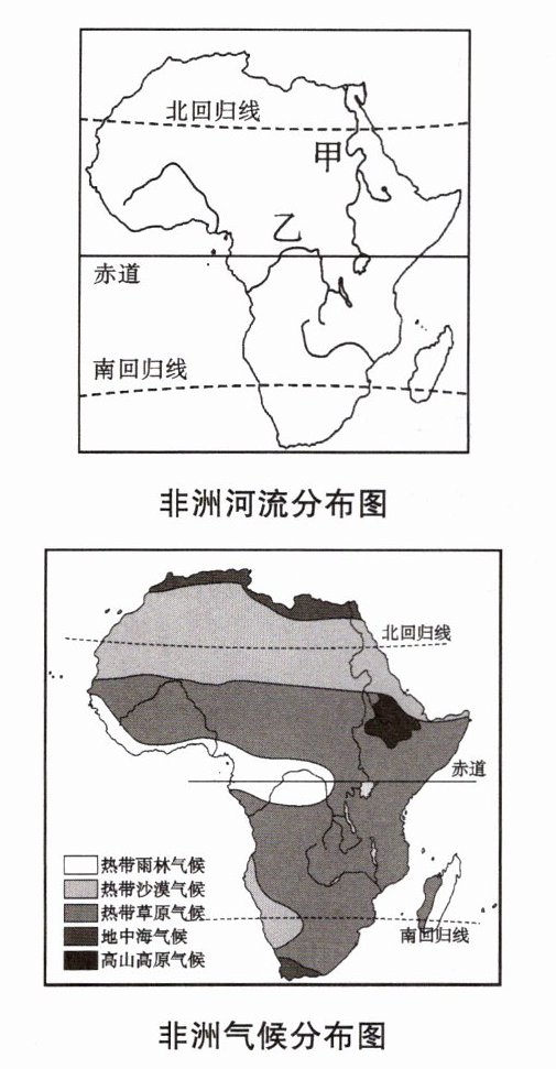 (1)图示甲河和乙河都是世界著名的河流,其中乙河的水量大,水能资源丰富。原因是乙河主要流经______气候区,降水丰富;乙河所处的主要地形区为______,河流流域面积广,支流众多,落差大,水能丰富。