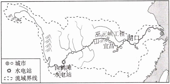 (2024·山东聊城中考)位于长江上游的白鹤滩水电站,在建设中斩获 6 项“世界第一”,该水电站与长江其他水电站联合调度,形成世界上最大的清洁能源走廊。读长江流域示意图,完成第 16—17 题。