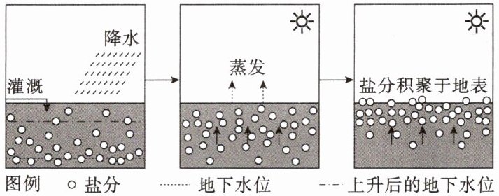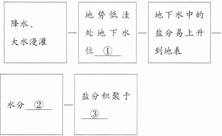 (1)依据图文材料,说明土壤盐碱化的形成过程,完成框图内容。