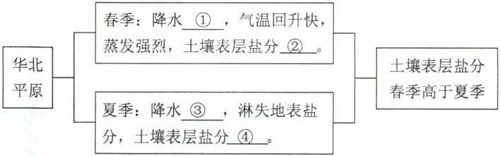 (2)分析华北平原土壤表层盐分春季高于夏季的自然原因,完成框图内容。