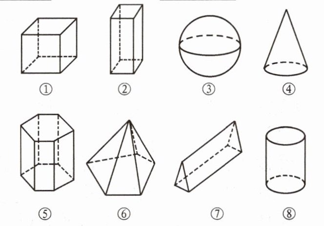 例 1 如图所示为 8 个立体图形. 其中,柱体的序号为